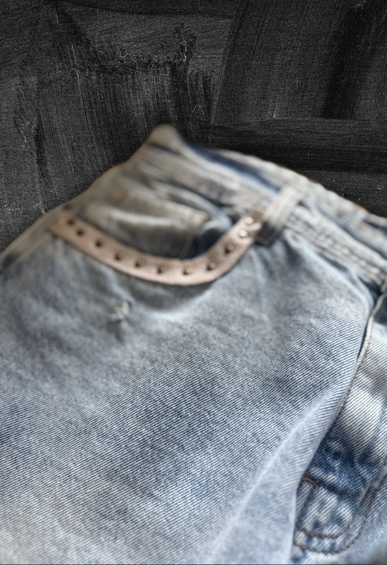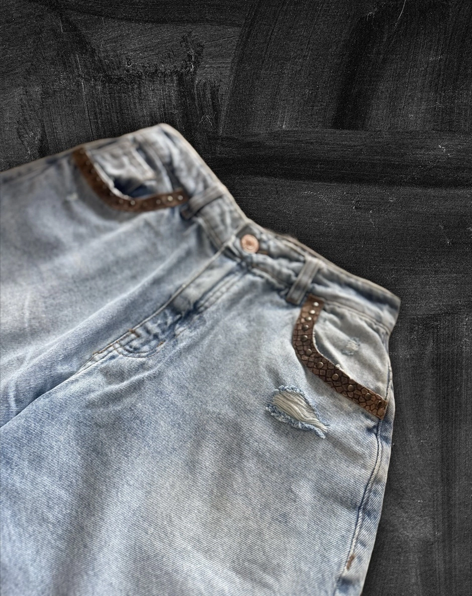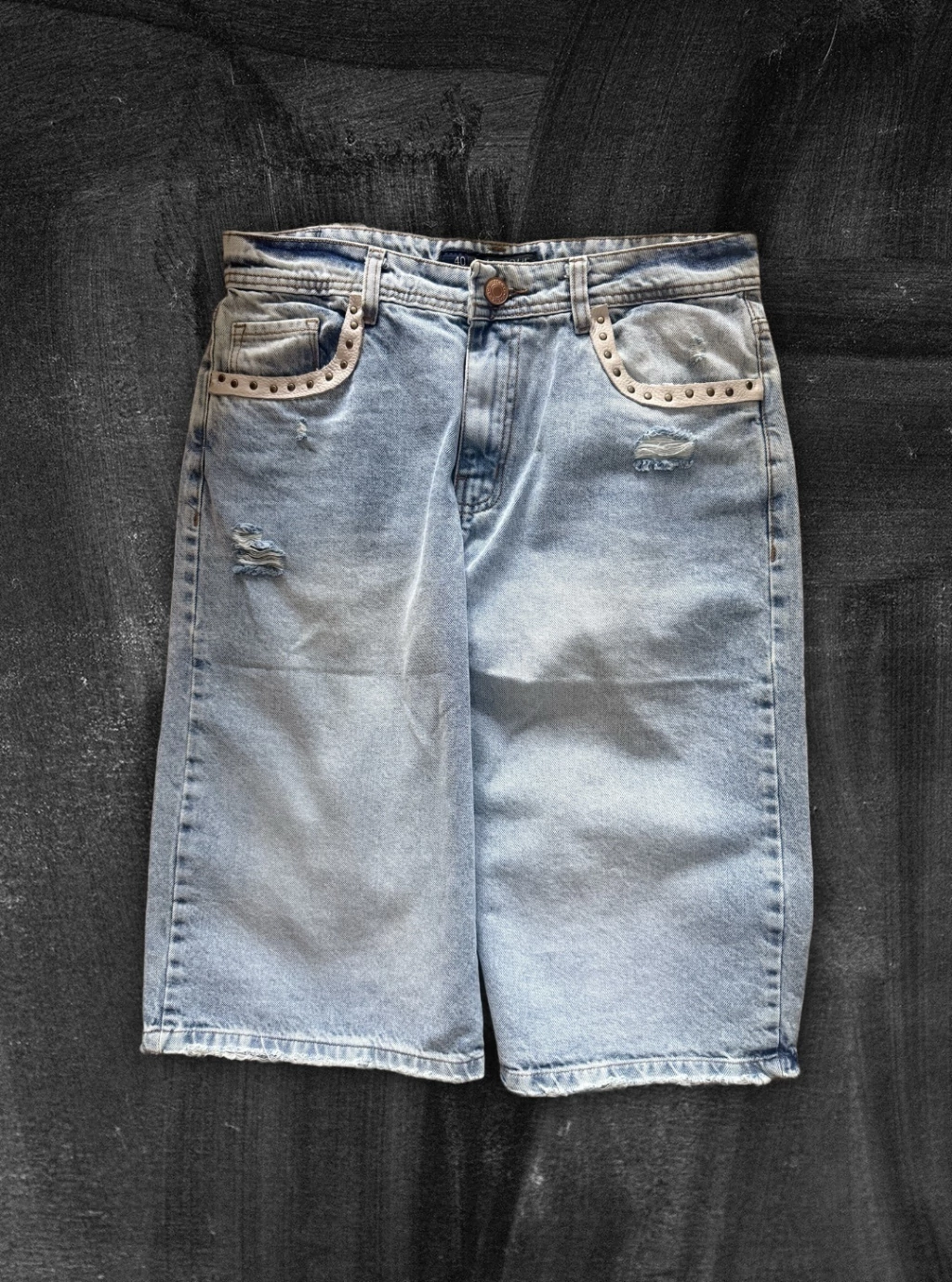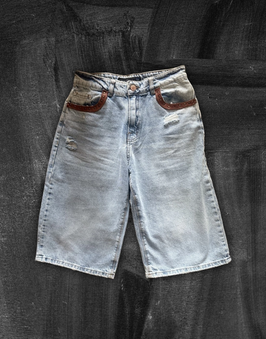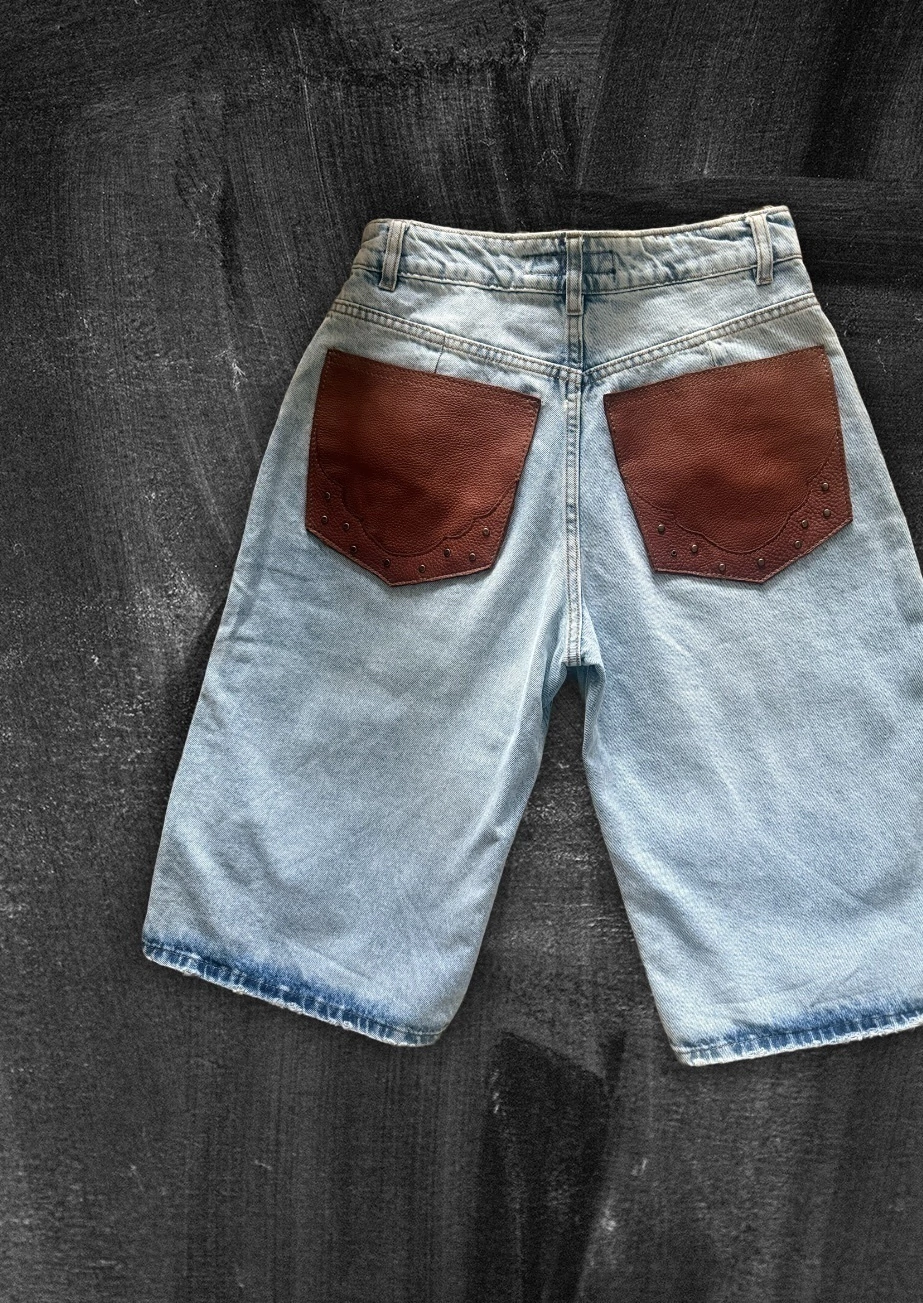 Bermuda de Jean con intervención de cuero en los bolsillos.