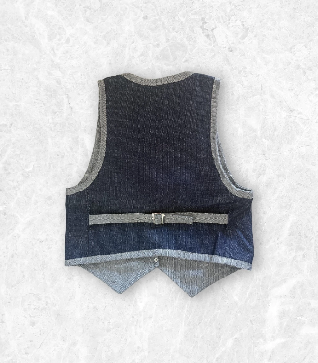 Chaleco realizado en Jean con detalles de vivos y bolsillos a contratono. Para mejorar su calce lleva tiras en la espalda para ajustar a la cintura