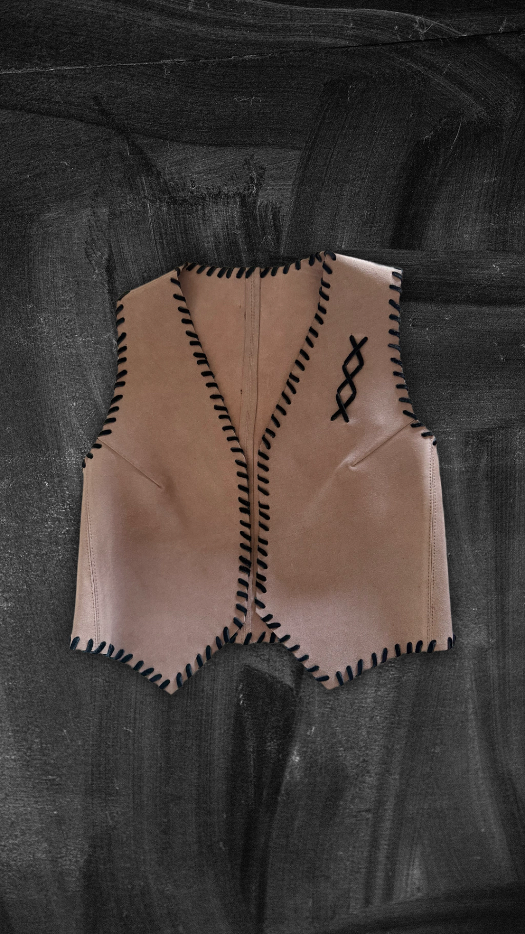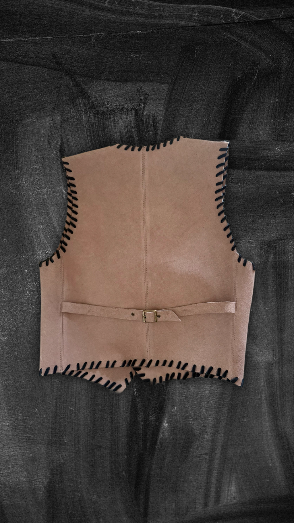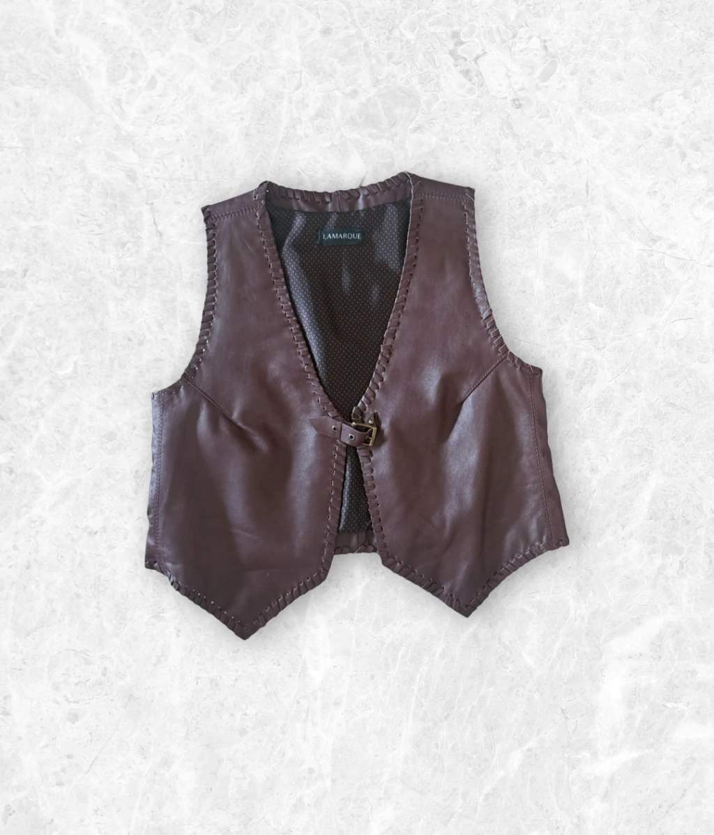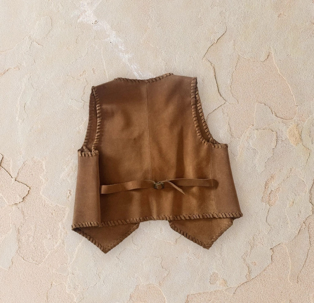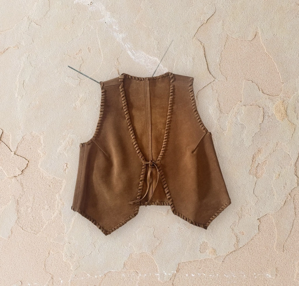 Chaleco realizado en gamuza con detalles de tientos a contratono .