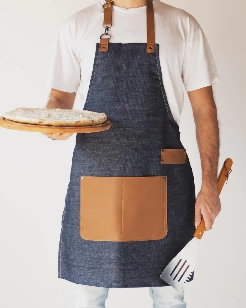 Delantal con detalles en cuero, confeccionado en jean.