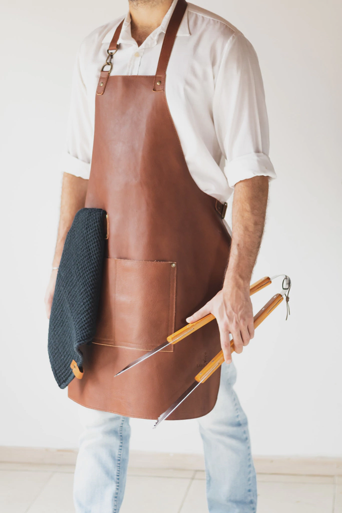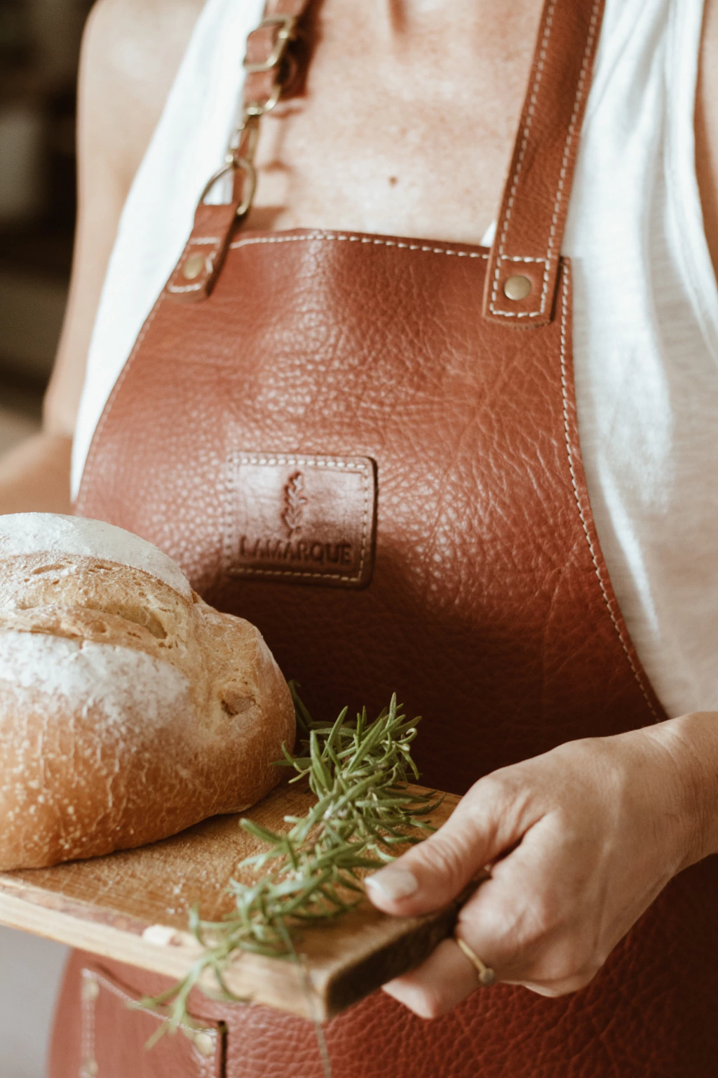 Delantal íntegramente confeccionado en cuero curtido vegetal.