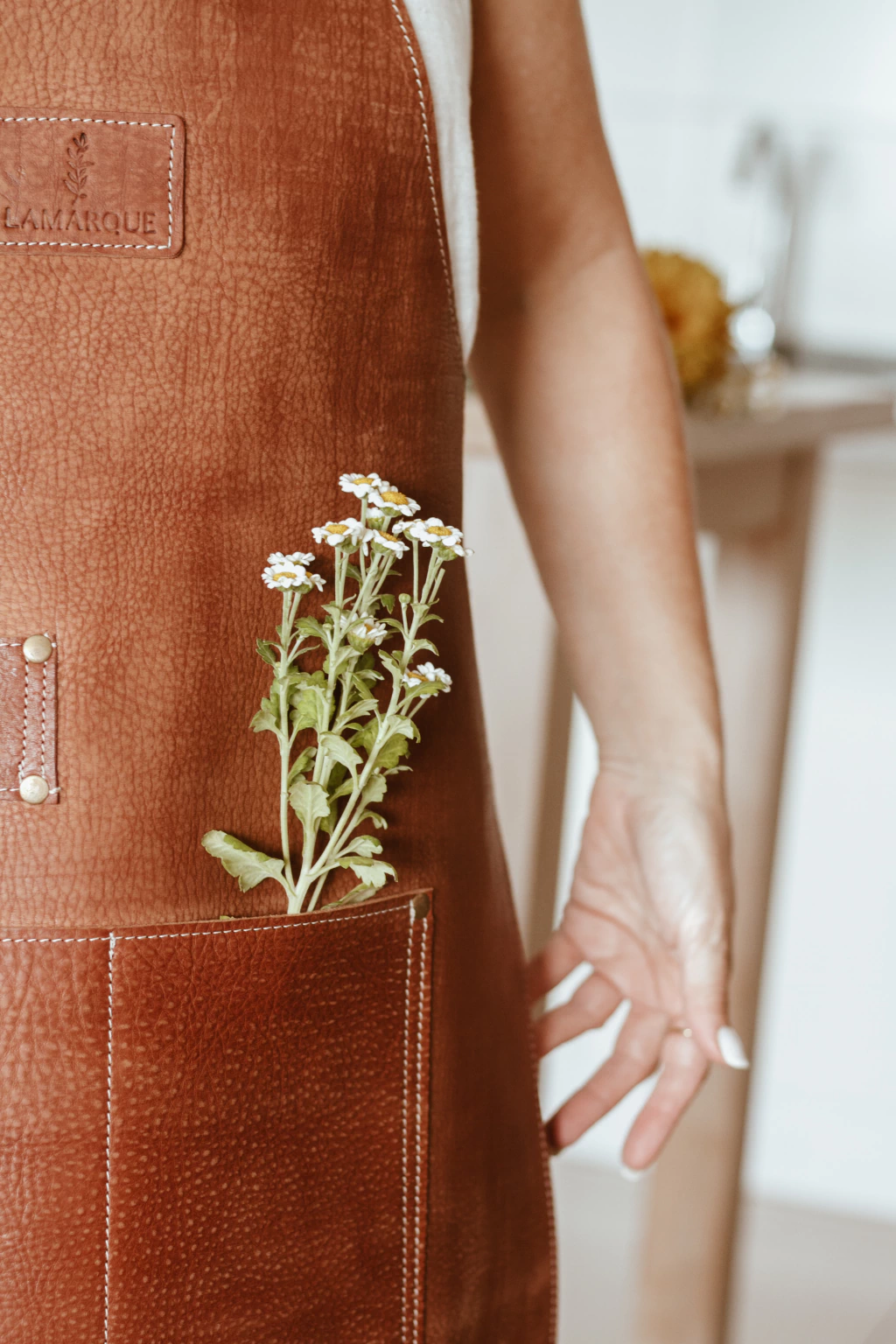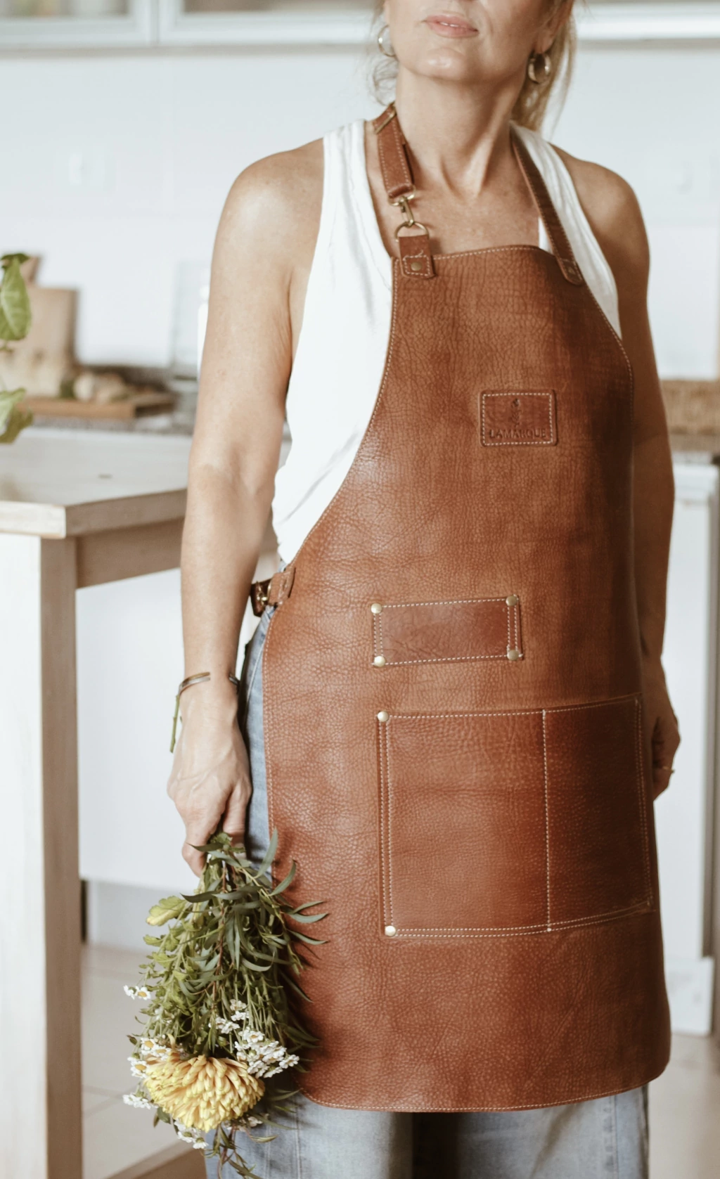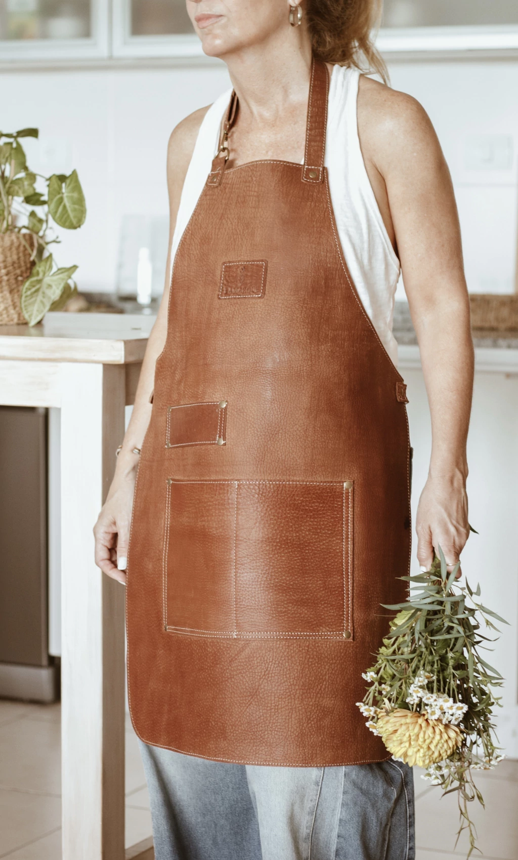 Delantal íntegramente confeccionado en cuero curtido vegetal.
