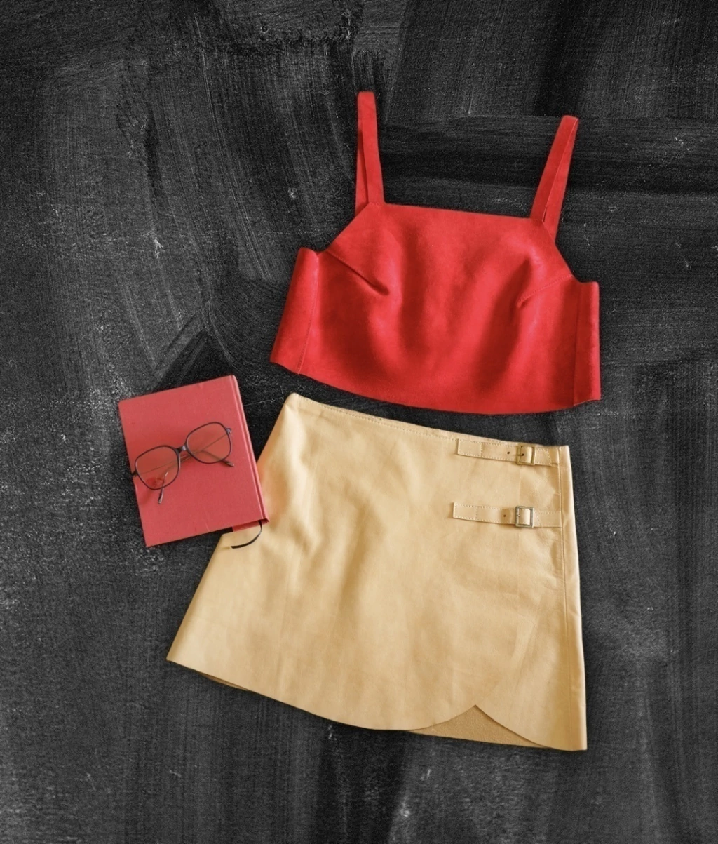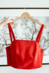 Top en cuero vacuno con detalle de flecos , 100% hecho a mano, con escote recto .