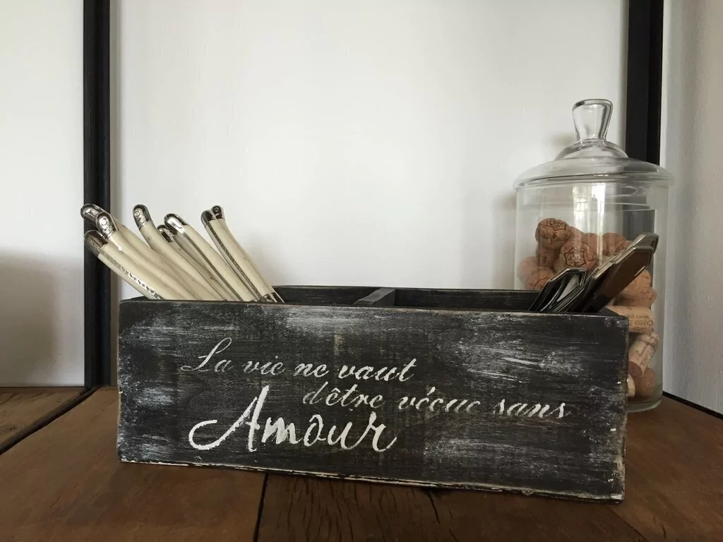 Cajón de madera con 2 divisiones. Medidas : largo 30 x ancho 15 x alto 10 cm . Terminación : decapado