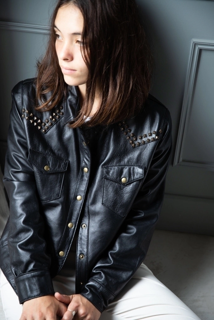 Camisa realizada en cuero de oveja forrada íntegramente con detalle de tachas en la pechera.